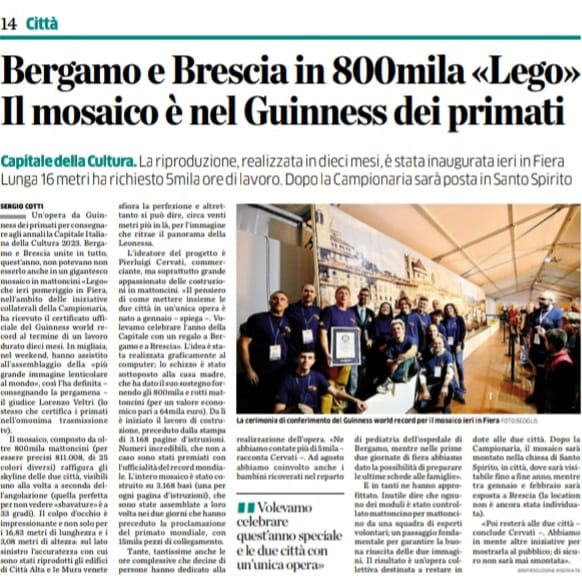 Bergamo e Brescia Capitali della cultura 2023 in mosaico con mattoncini LEGO da GUINNESS WORD RECORD.